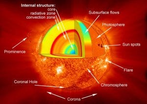 Nuclear fusion produces a huge amount of energy. It is radiated outward to the surface, atmosphere, and beyond.