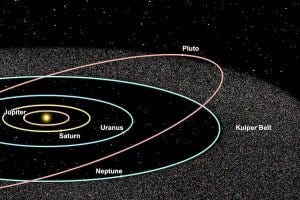 The Kuiper Belt (also known as the Edgeworth–Kuiper belt) is a region of the Solar System that exists beyond the eight major planets, extending from the orbit of Neptune (at 30 AU) to approximately 50 AU from the Sun. It is similar to the asteroid belt, in that it contains many small bodies, all remnants from the Solar System’s formation. But unlike the Asteroid Belt, it is much larger – 20 times as wide and 20 to 200 times as massive.